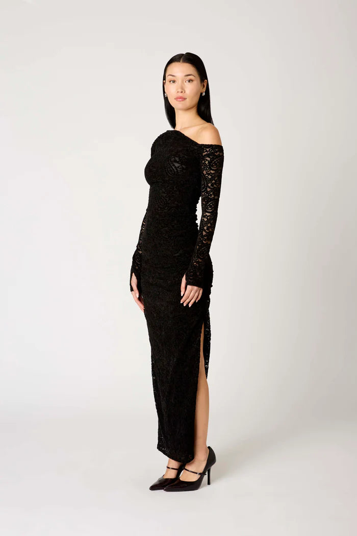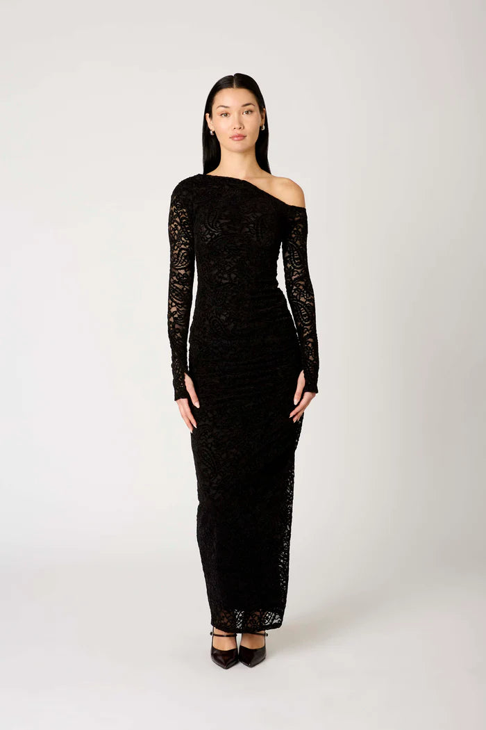 The Cleo Top is designed to stand out with its one-shoulder neckline and allover velvet burnout lace that adds soft texture and depth. Its body-hugging, cropped silhouette stops right at the waistline, creating a sleek base that’s perfect for pairing high or low.