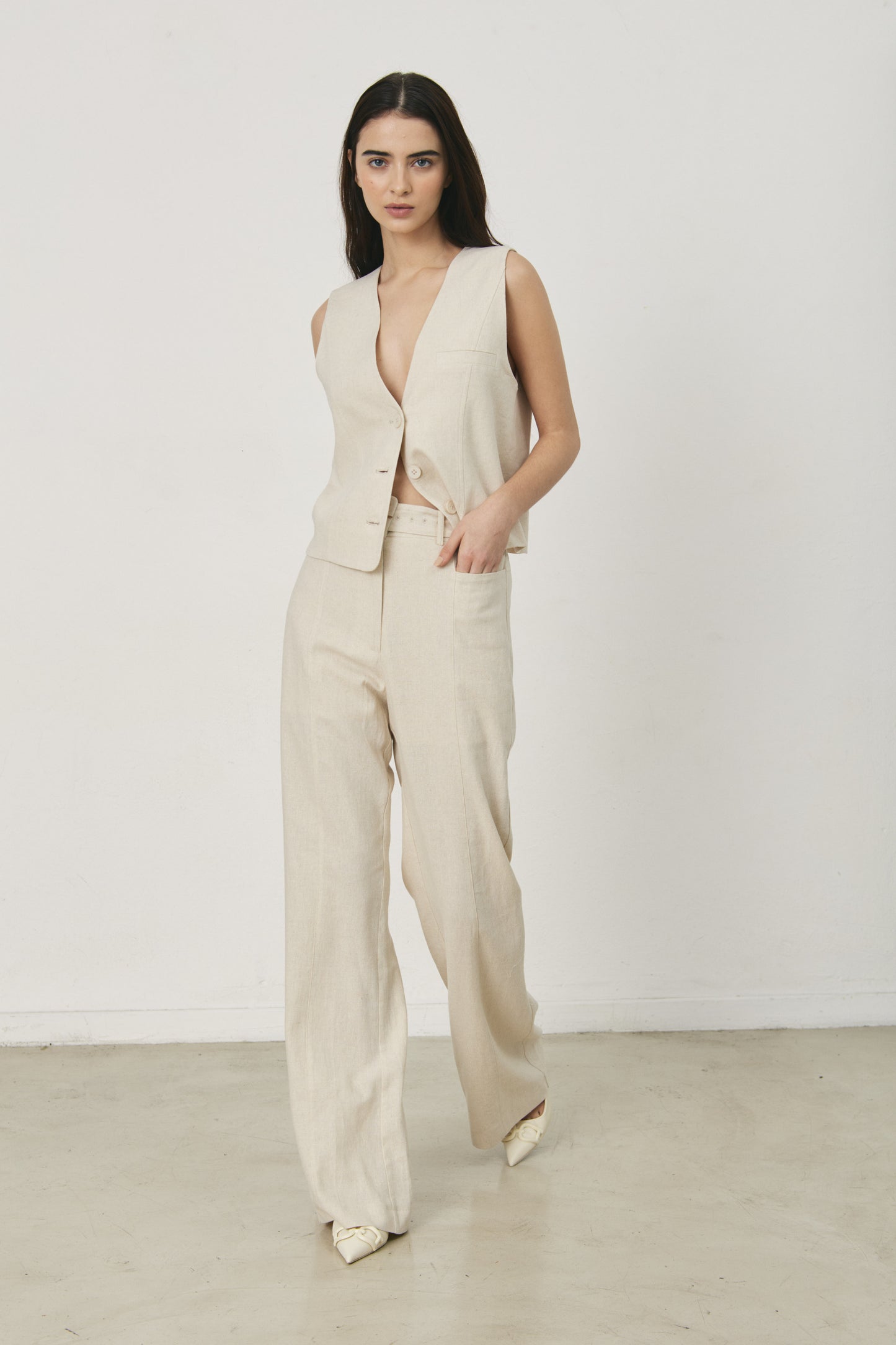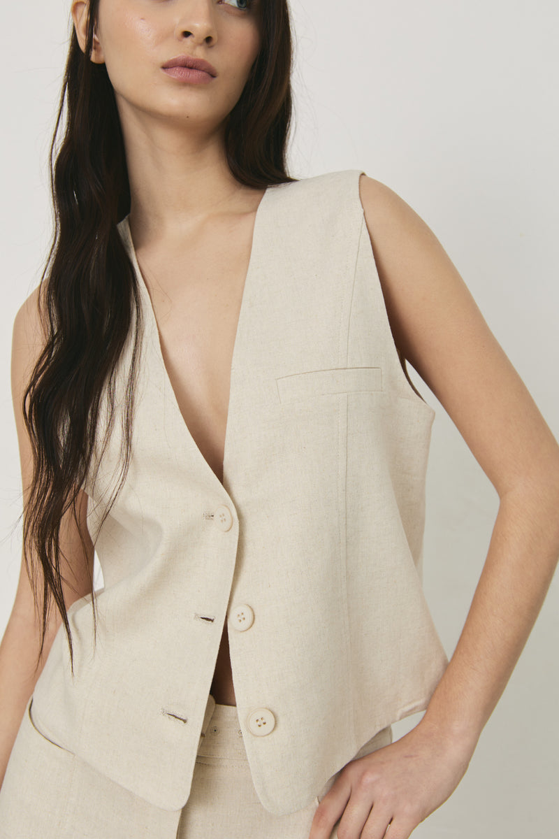 - Linen blend waistcoat. V-neckline. False welt pocket. Lined. Front button closure