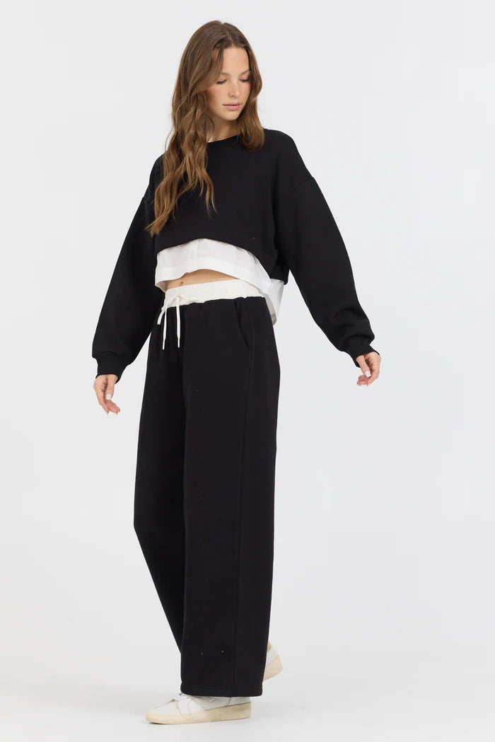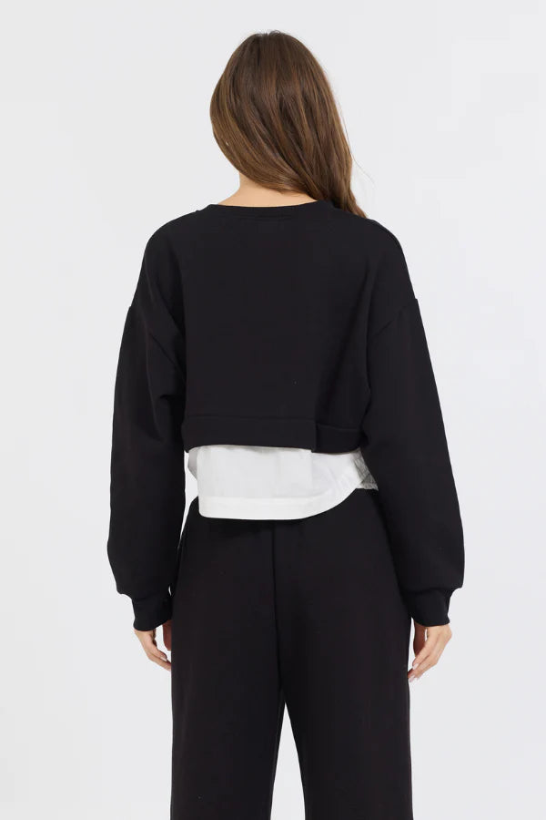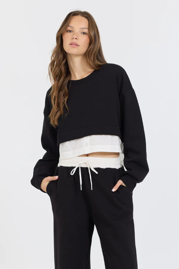 The Black/ White Essential Fleece Crewneck W/ Poplin Insert features: