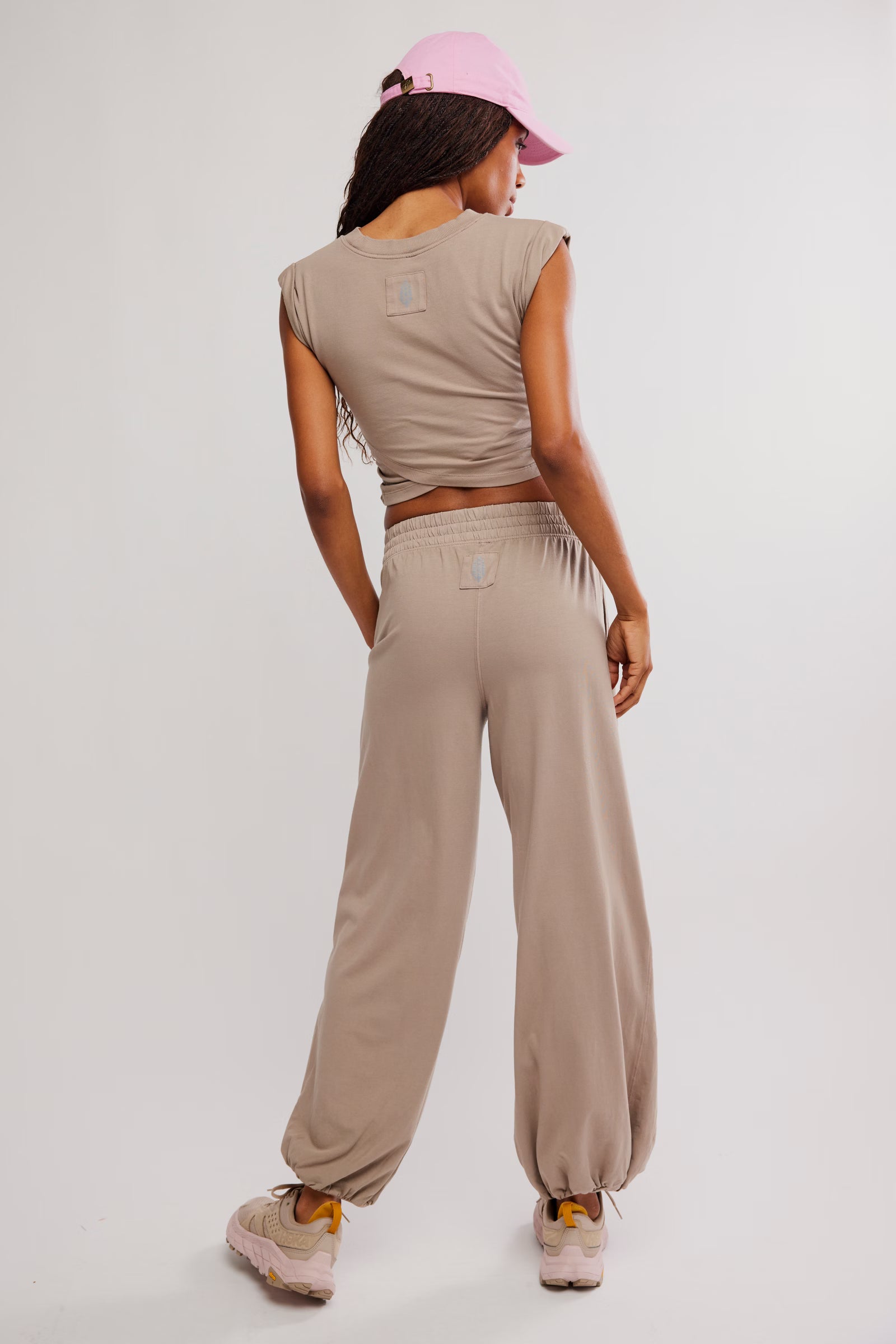 Features: Soft, jersey fabrication; relaxed fit; cropped muscle tee top with seaming detail; ankle length pant with mid-rise waist and wide leg; elasticated waistband and cuffs; crossover detail on top; ribbed collar; side seam pockets