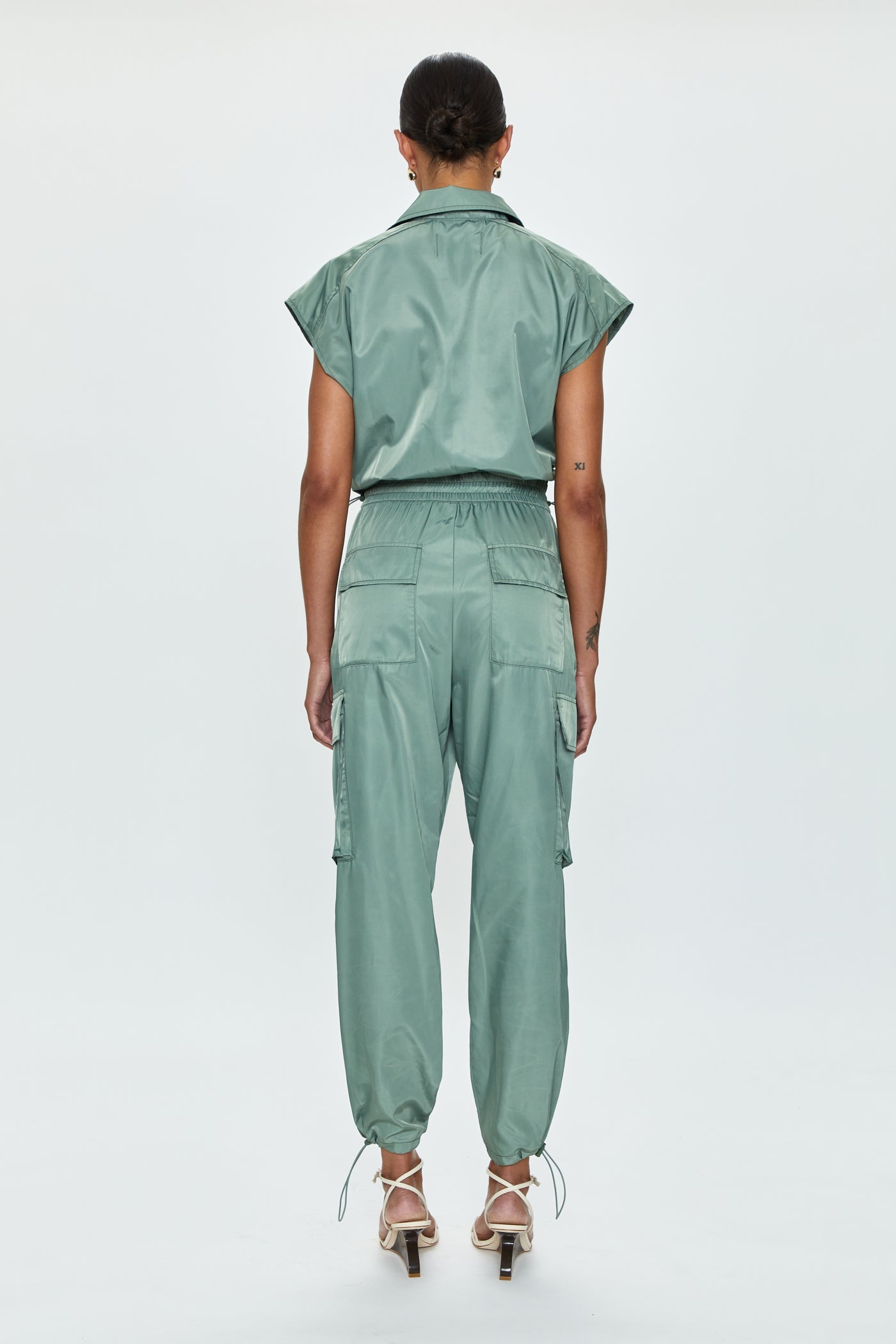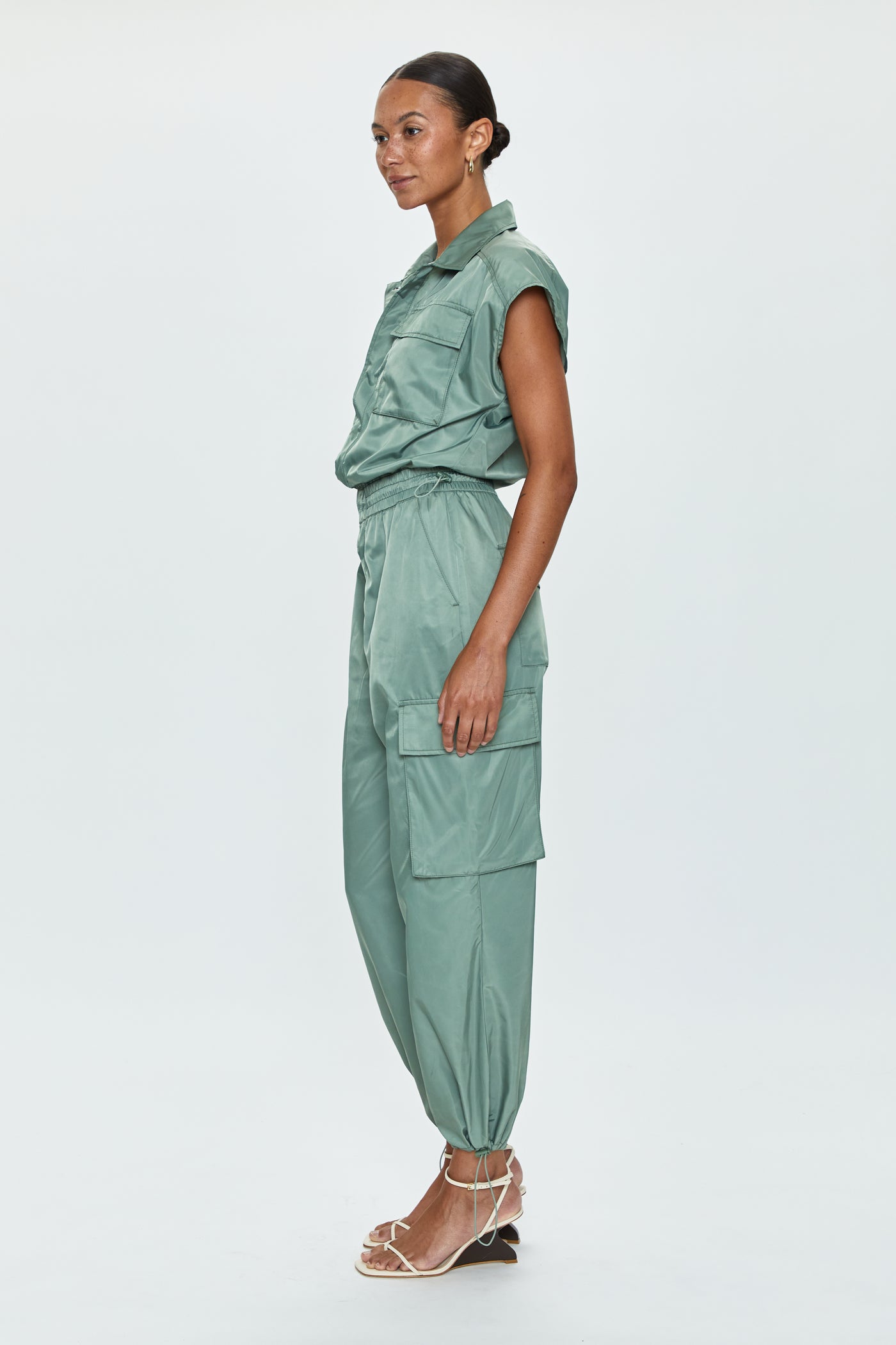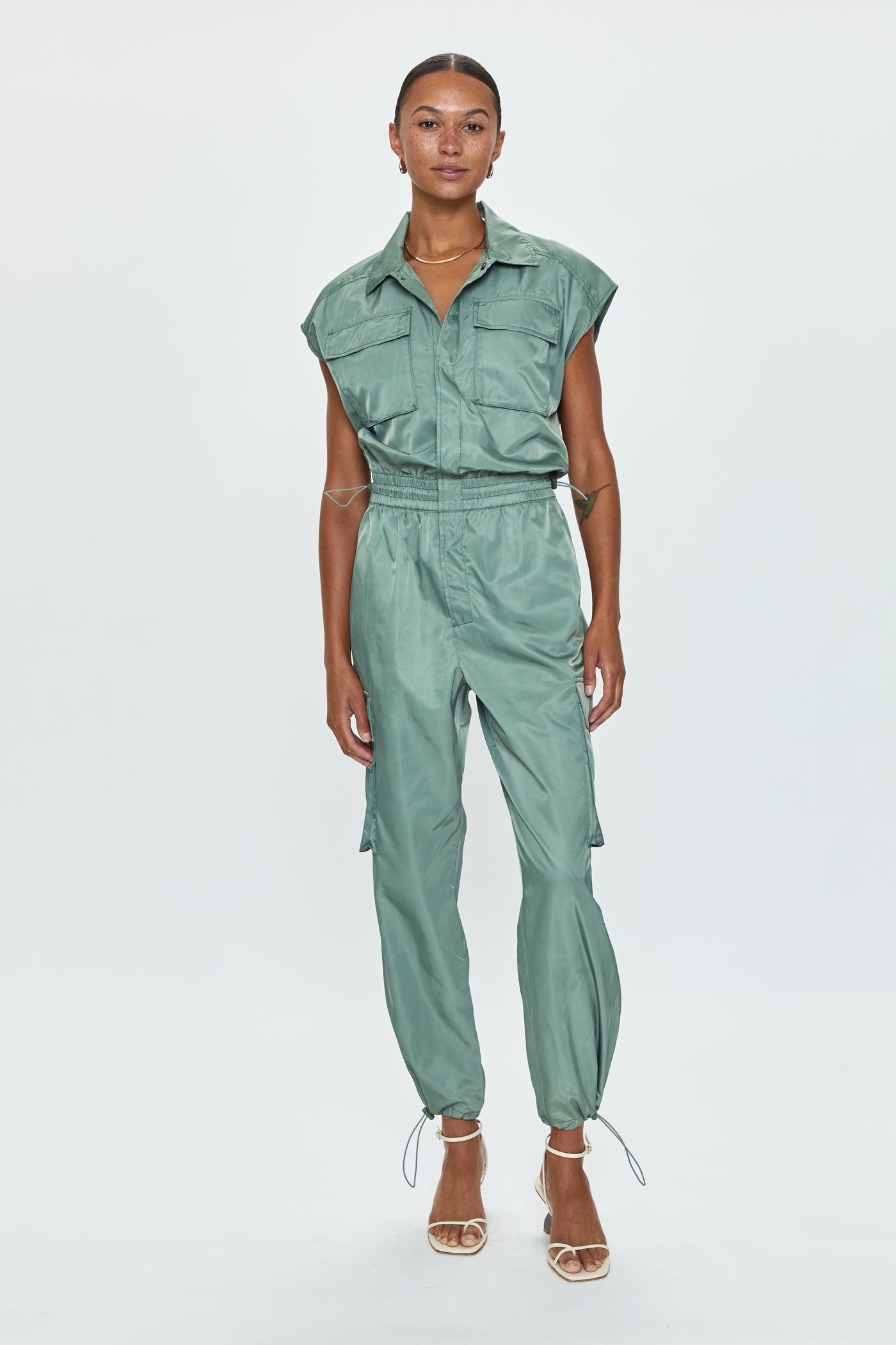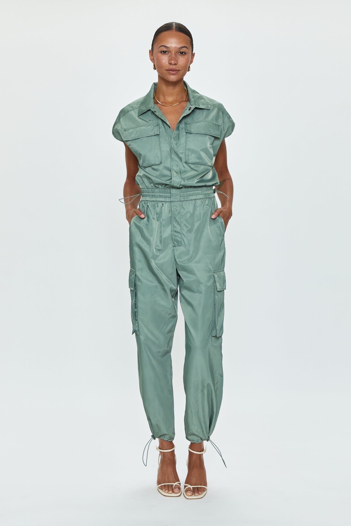 Cargo jumpsuit silhouette crafted from a lightweight nylon fabric that keeps it's cool, with a slight sheen that dresses up its utilitarian pockets and detailing. Adjustable ankle toggles adapt the fit between a jogger or straight leg shape as desired. Snap button front closure with flap pockets.