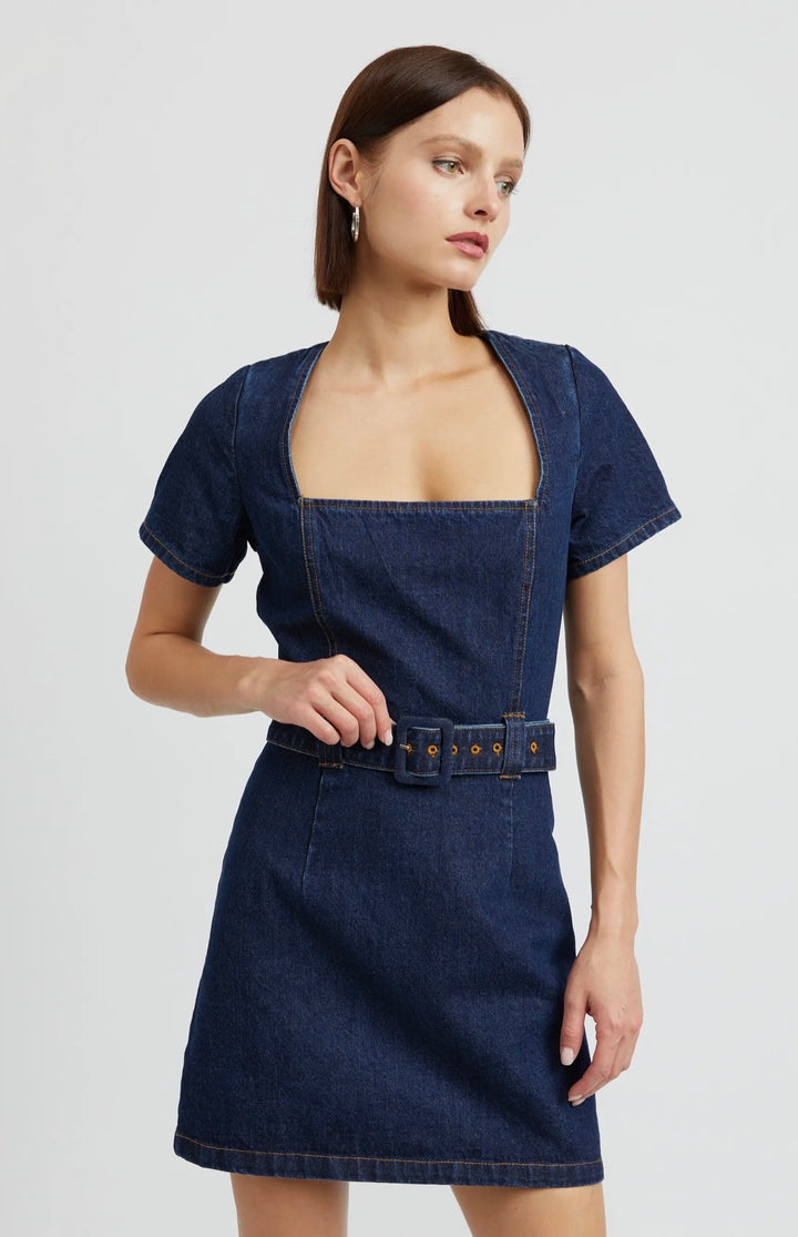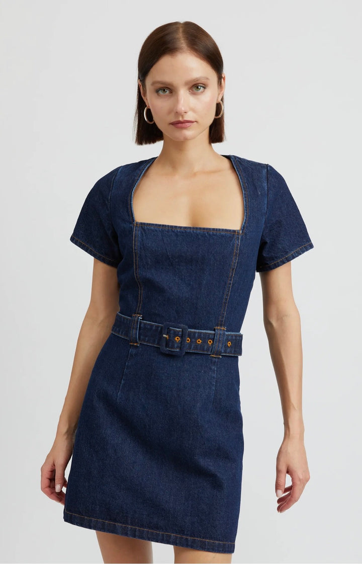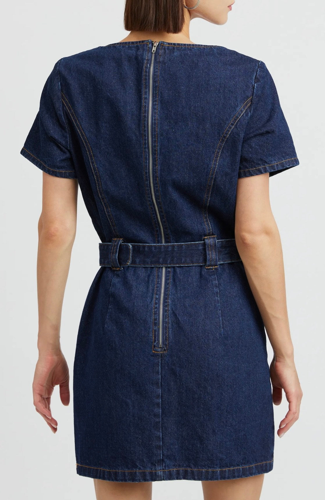 A matching belt wraps around your waist, hugging your curves perfectly when you wear this nonstretch-denim minidress elevated by princess seams.