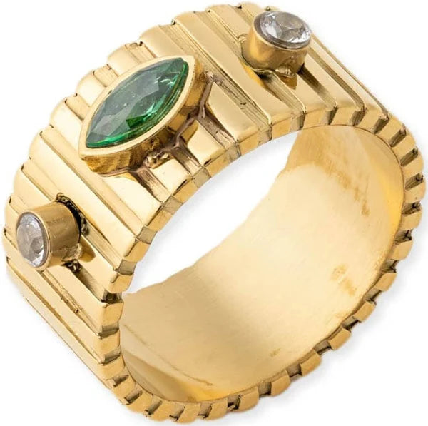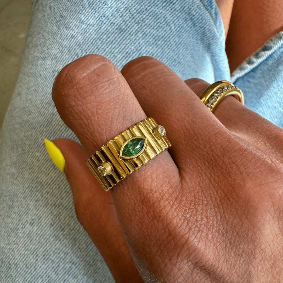 The Maya ring is a stunning fluted cigar band ring with gorgeous emerald and cubic zirconia accent stones. Elevate any look with its elegant and timeless design.
