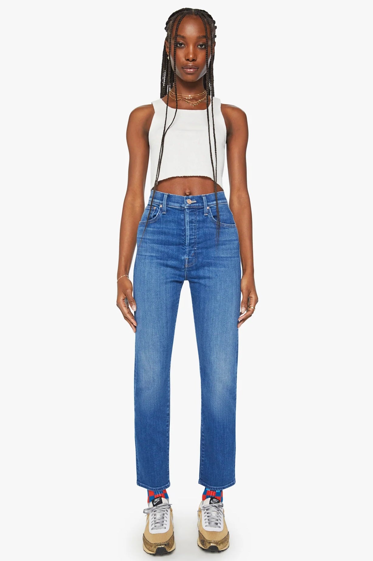 This slim straight-leg was adopted from our men’s line and features a button fly, low-set back pockets, high waist and a 29-inch inseam. Made from denim with a touch of stretch, Across The Finnish Line is a mid-blue wash with whiskering and fading at the knee.