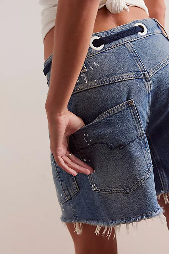 Features: Pull-on design, drawcord waist detail, oversized pouch pockets, raw-edge hem
