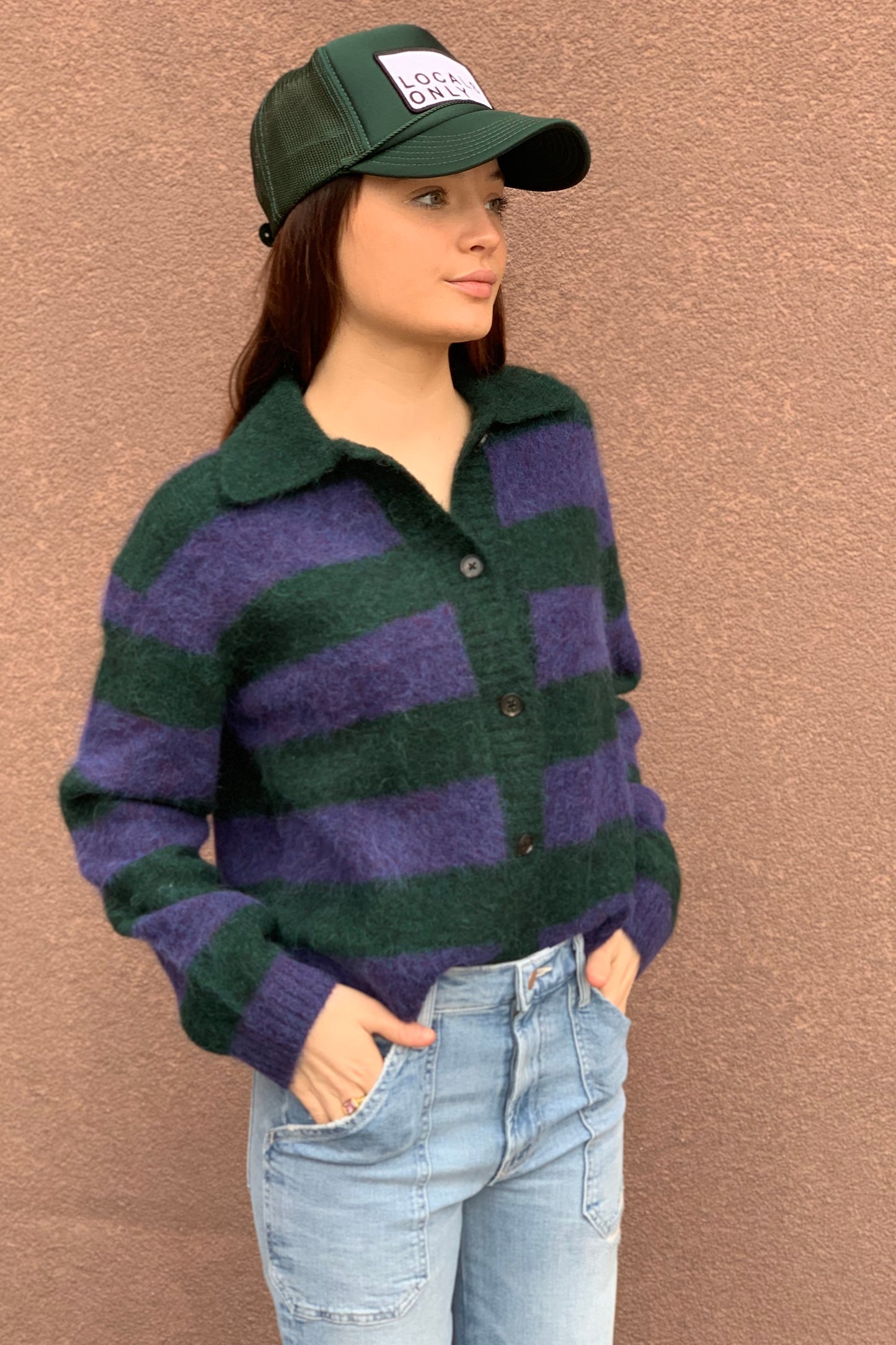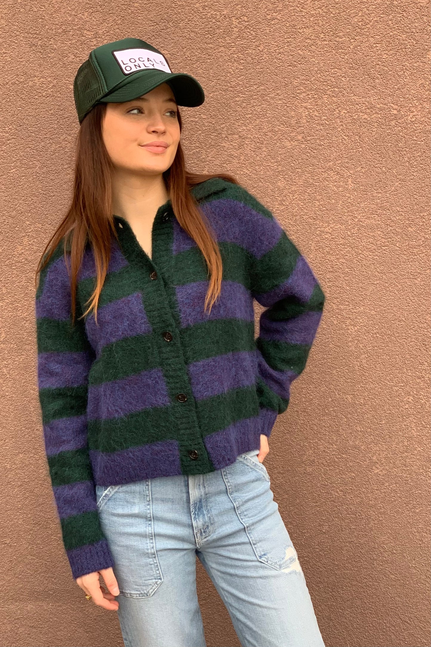 Make an entrance in this bold, yet classic sweater, crafted from a soft and warm alpaca blend. With a full button placket, collar, and unique purple and forest green stripes, this style is sure to be on repeat in your collection.