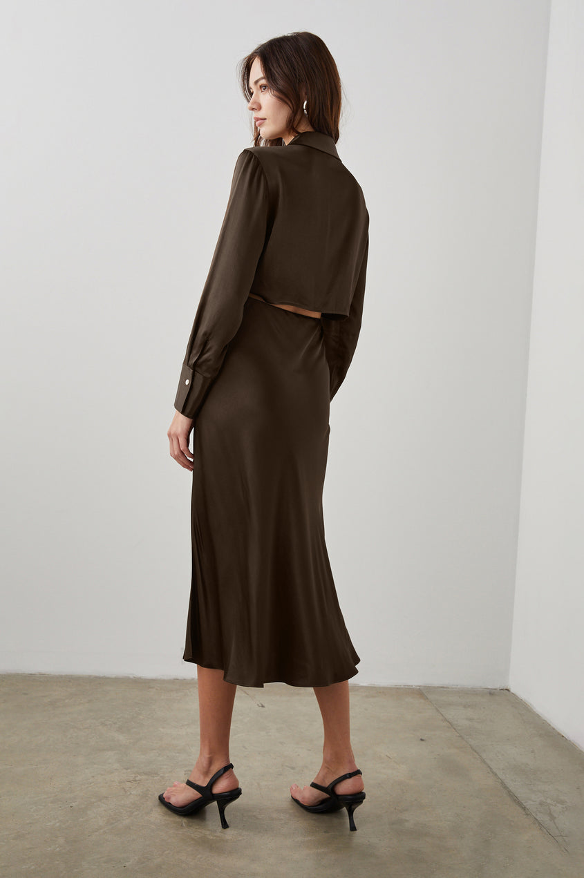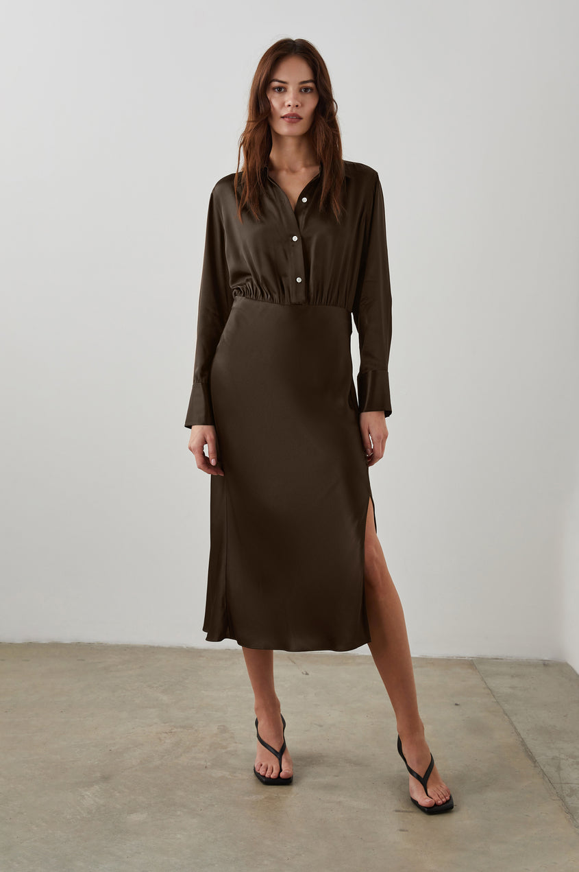 Prepare to feel sophisticated and confident in this unique dress. Cut from satin back crepe, this style moves and shines with you. It features a classic buttondown on the top half, cinching at the waist, and flowy A-line skirt.