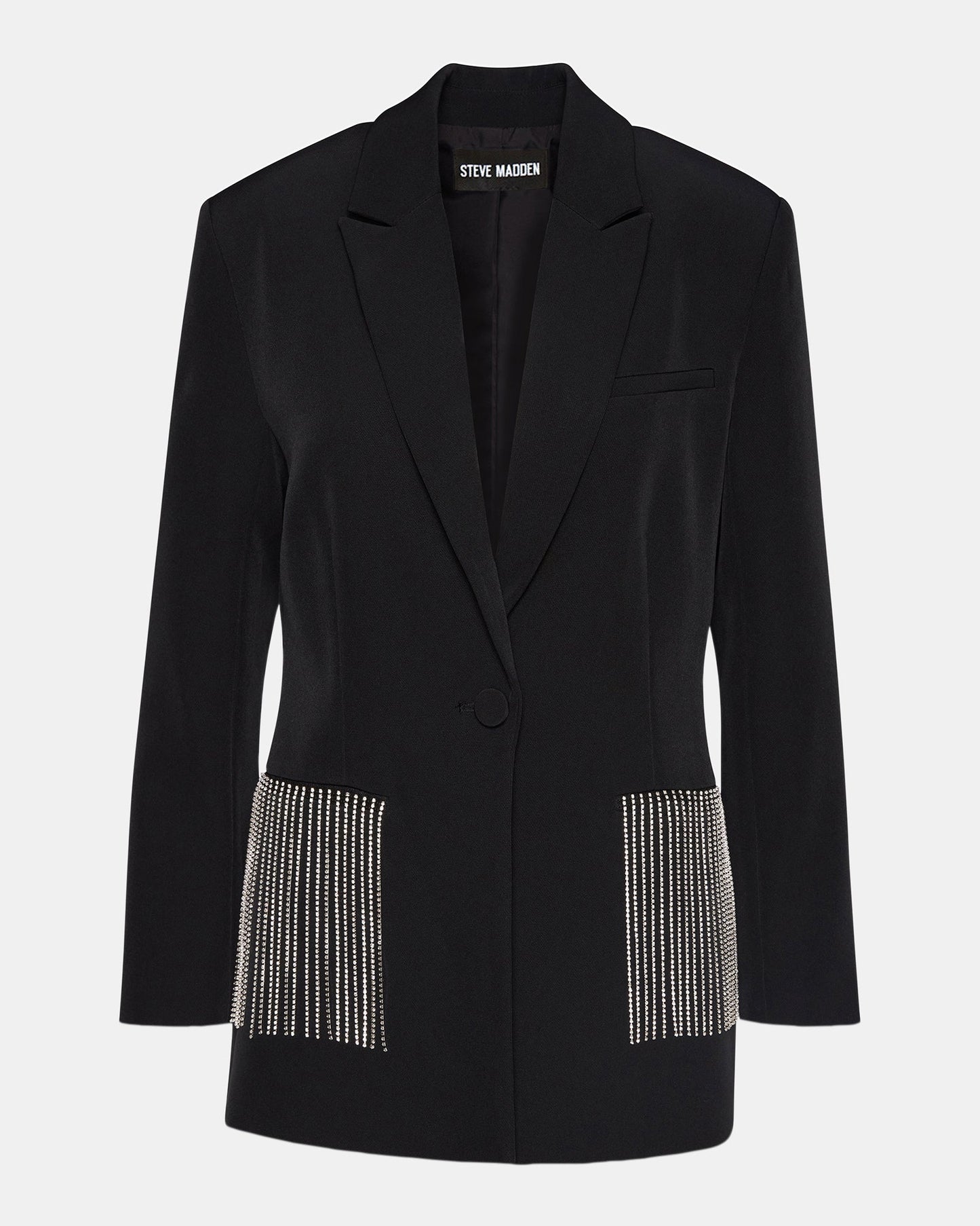 The KENDRA blazer features a structured and tailored fit with rhinestone chain fringe at the pockets giving this style sparkle and movement.