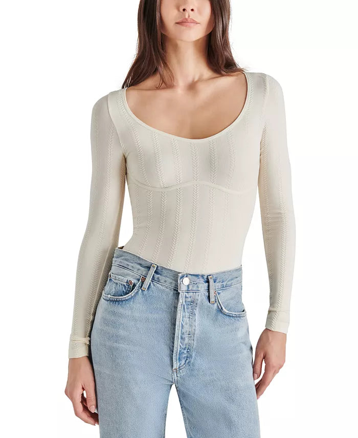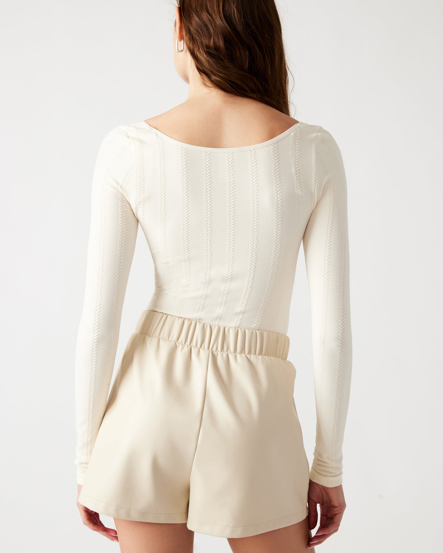 A wide neck, bodycon fit, and shaping under the bust make the SERENT bodysuit an ultra-flattering design. Tonal raised herringbone stripes add subtle texture to the look.
