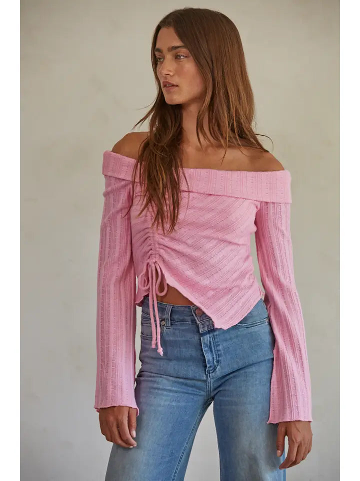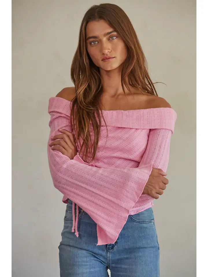 - Fold Over Off The Shoulder Long Sleeve Top With Slits On Sleeve