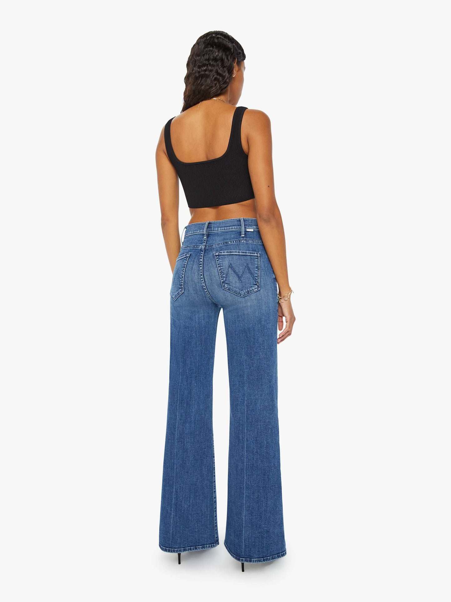 Between a rock and a hard place. 70s-inspired wide leg jeans with a high rise, 31-inch inseam and a clean hem. Made from denim with a touch of stretch, Caving In is a mid-blue wash with whiskering and fading at the knees.