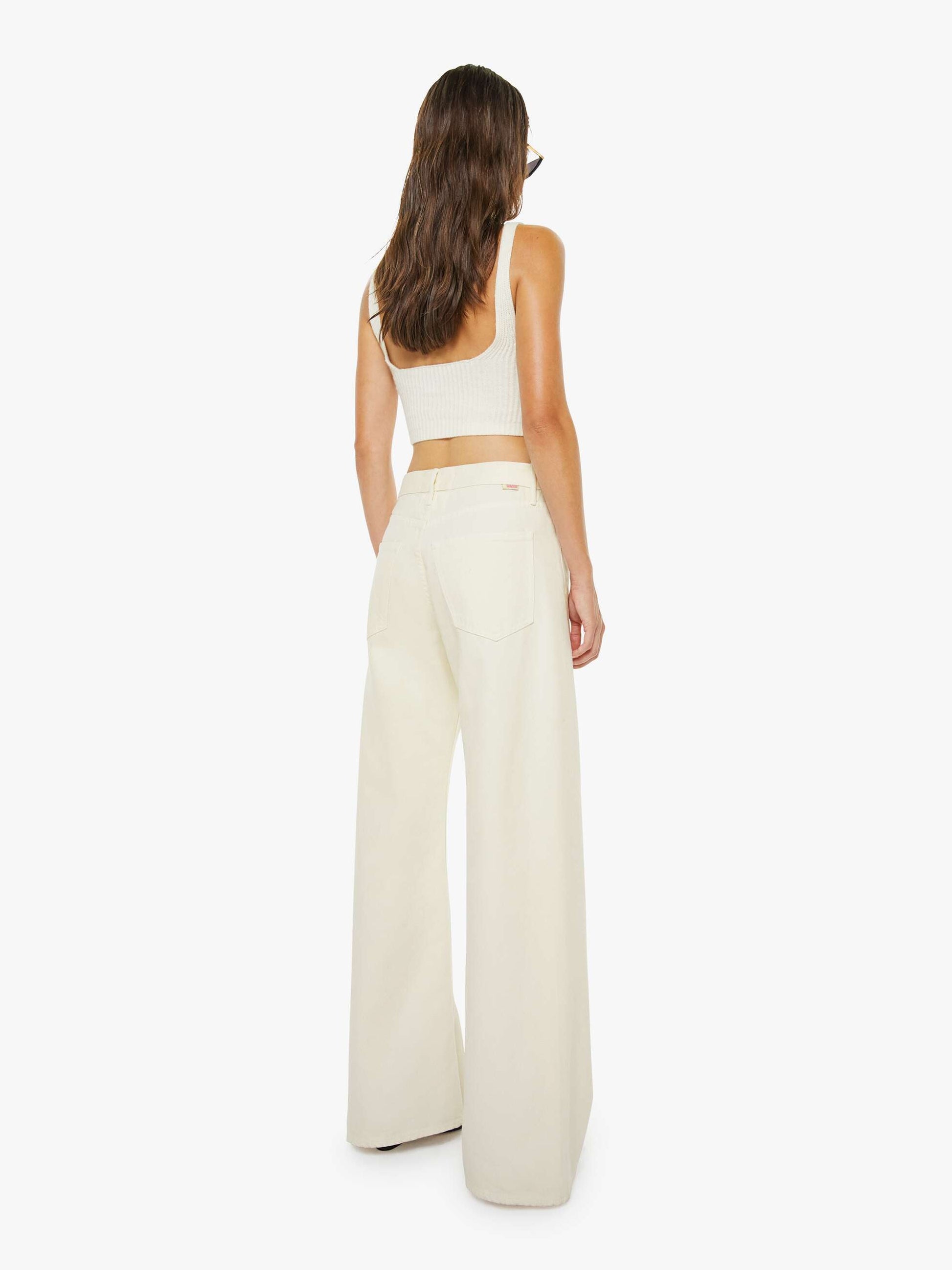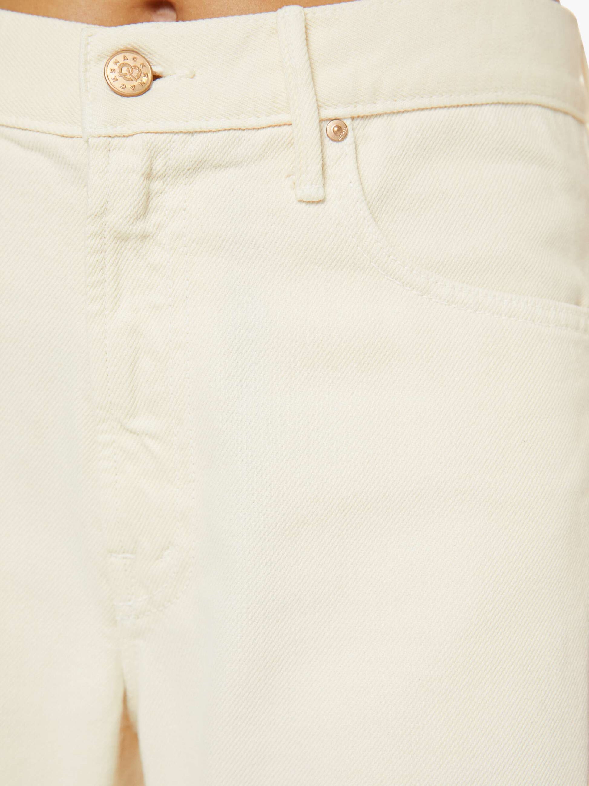 Wide leg jeans from SNACKS!, a collection of unconstrained silhouettes leaning into exaggerated shapes and extreme proportions. Experimental and non-era specific. For everyone, or not. Designed to sit on the hips with a slouchy fit, these high-rise jeans have a zip fly, loose wide leg with a curved outer seam and a 32-inch inseam with a clean hem. Made from a rigid cotton blend, Natural is a creamy off-white with a pretzel-detailed button and candy-inspired interior rivets. Would you like a treat?