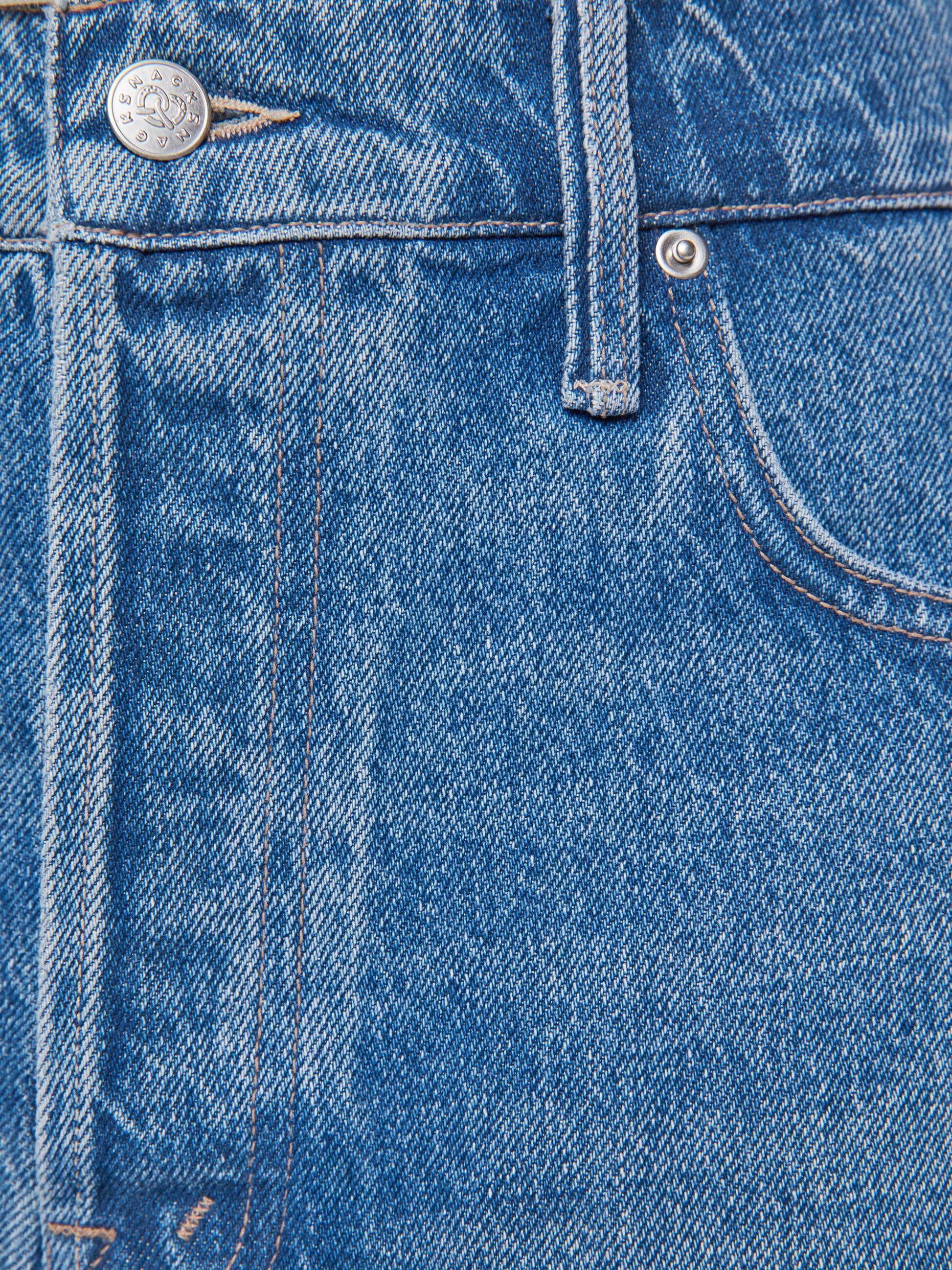 Denim shorts from SNACKS!, a collection of unconstrained silhouettes leaning into exaggerated shapes and extreme proportions. Experimental and non-era specific. For everyone, or not. These low-slung shorts are designed with a 3.5-inch inseam, loose leg and frayed hem. Made from a recycled cotton blend, Chew Toy is a mid-blue with whiskering, fading, a pretzel-detailed button and candy-inspired interior rivets.