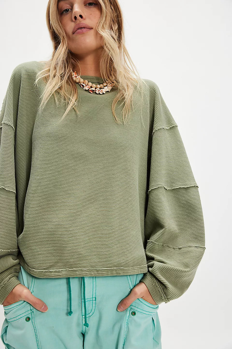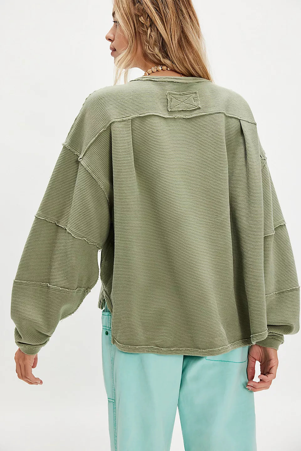 Features: Ribbed fabrication, scoop-neckline, drop-shoulder sleeves with cuffs, defined seam detailing with raw trim