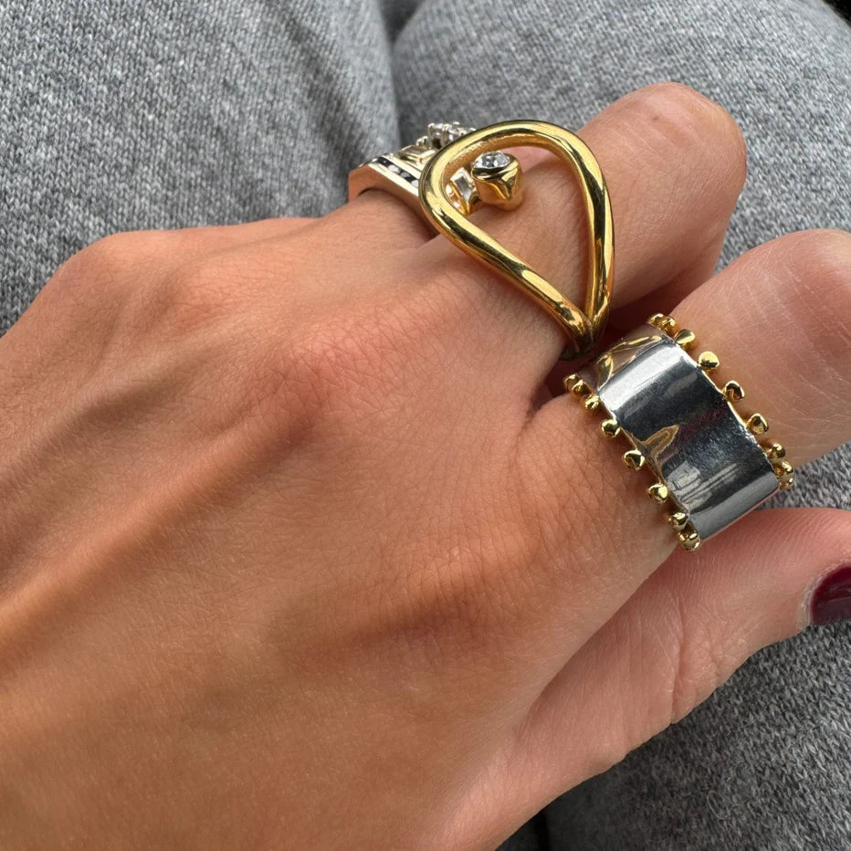 The Tribeca Ring is a one-of-a-kind cigar band ring that exudes edginess and boldness. Its unique design features striking gold accents, and is crafted with mixed metals for a truly unique and eye-catching look. Plus, it's water-resistant for added convenience. Elevate your style with this modern and versatile ring.