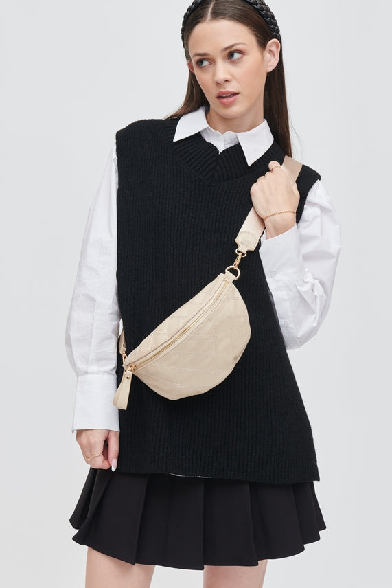 This stylish belt bag is perfect for holding everything you need while living your best life. Crafted with vegan leather, it features an all-over stitch design and gold hardware to add a touch of elegance. The additional strap make for easy switcheroos on the go. When you open up this bag, you'll find a printed fabric-lined interior with one zipper pocket and one slip pocket; perfect for keeping all of your essentials secure and organized. Get ready to rock 'n roll with the Lachlan!