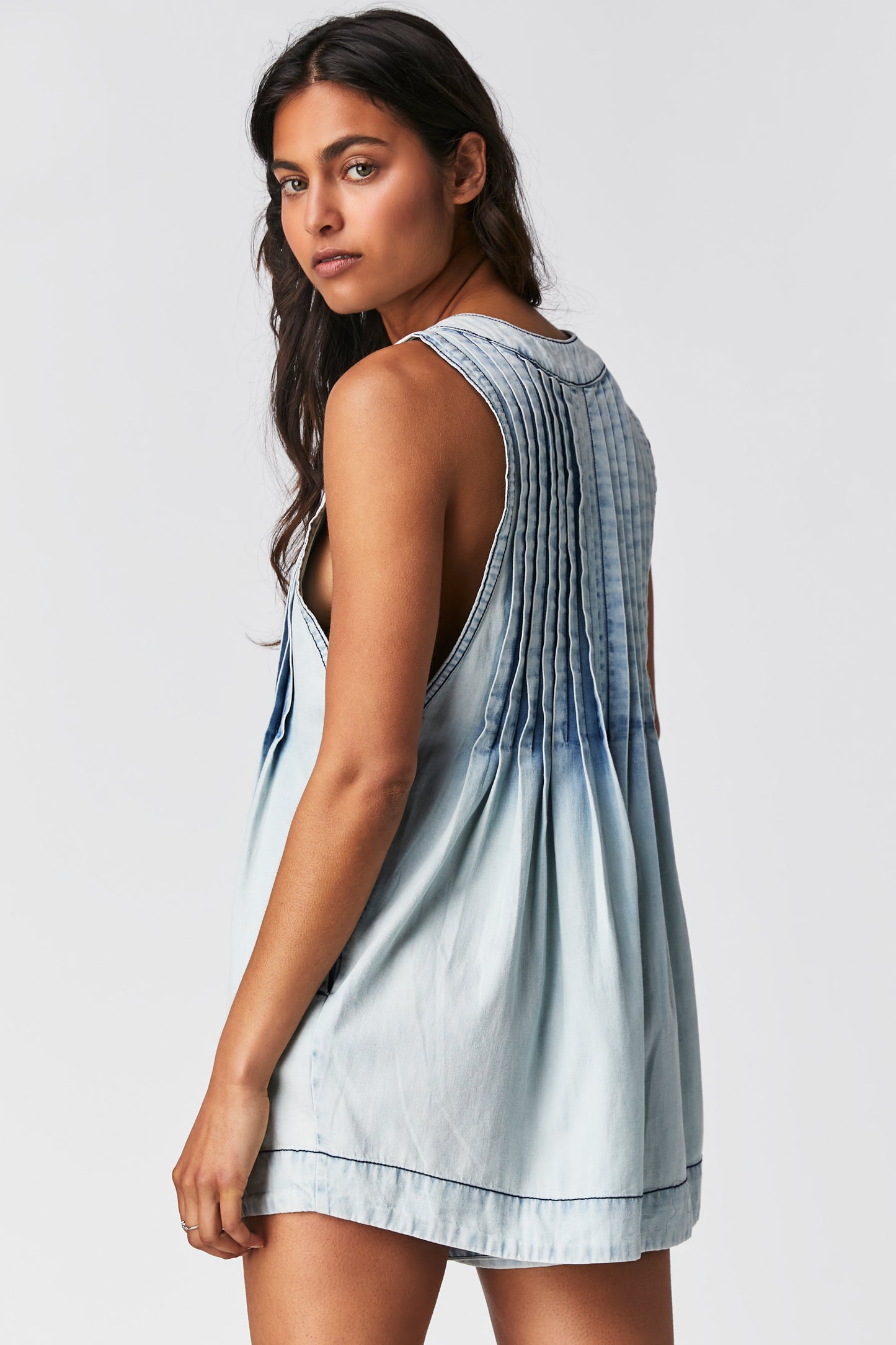 Totally timeless in a relaxed, ready-for-anything design, this staple romper is featured in a soft, denim-inspired design with pleating throughout and tie detail at front for added dimension.